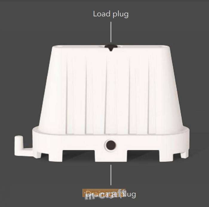 Barjerai ir divi vītņoti aizbāžņi; augšpusē atrodas iekraušanas aizbāžnis, bet apakšpusē - izkraušanas aizbāžnis, kas atrodas centrā. Izkraušanas aizbāzni izmanto stabilizējošās masas (ūdens vai smilšu) iztukšošanai. Katrai ceļa barjerai ir “maksimālā piepildījuma līmeņa” indikators. |